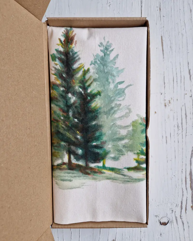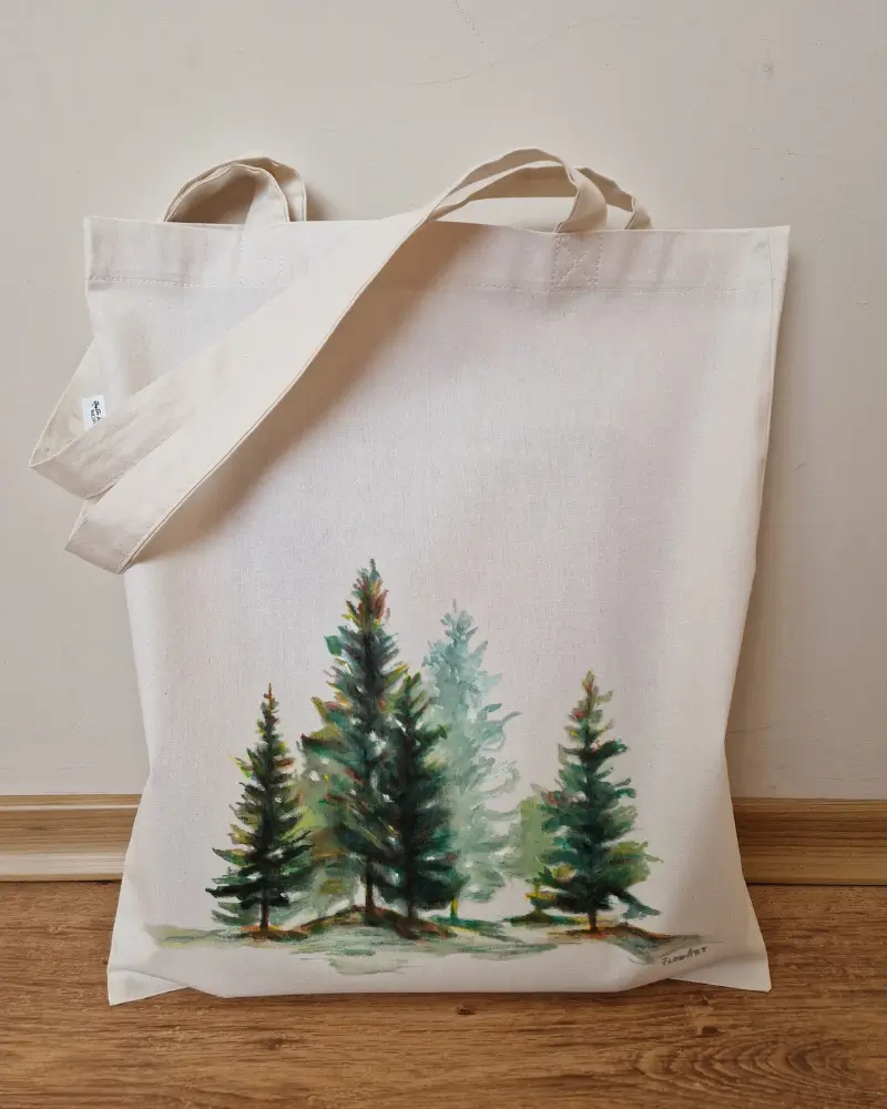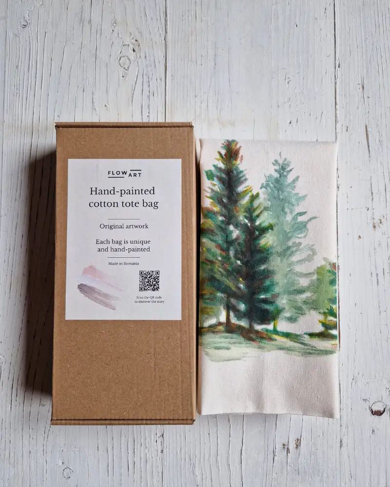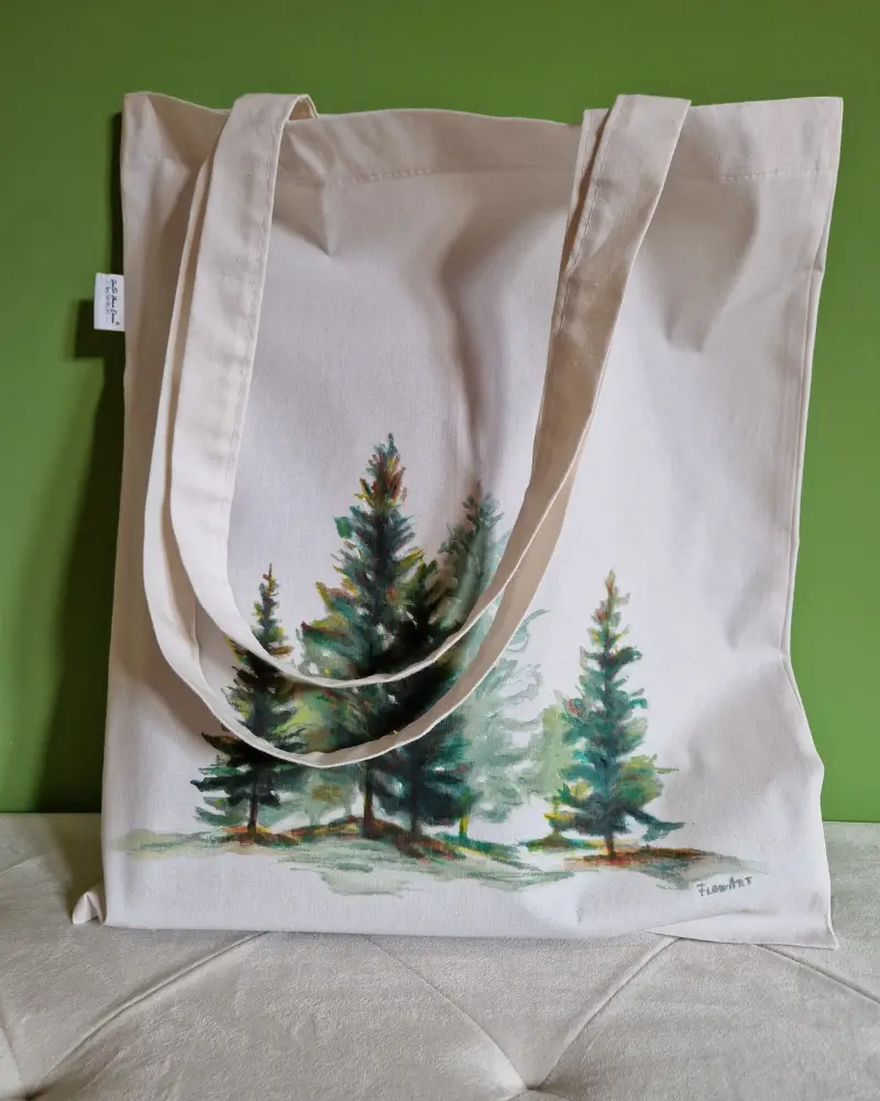Această sacoșă pictată manual redă frumusețea liniștită a naturii prin siluetele verzi ale brazilor – simbol al rezistenței și al echilibrului interior.