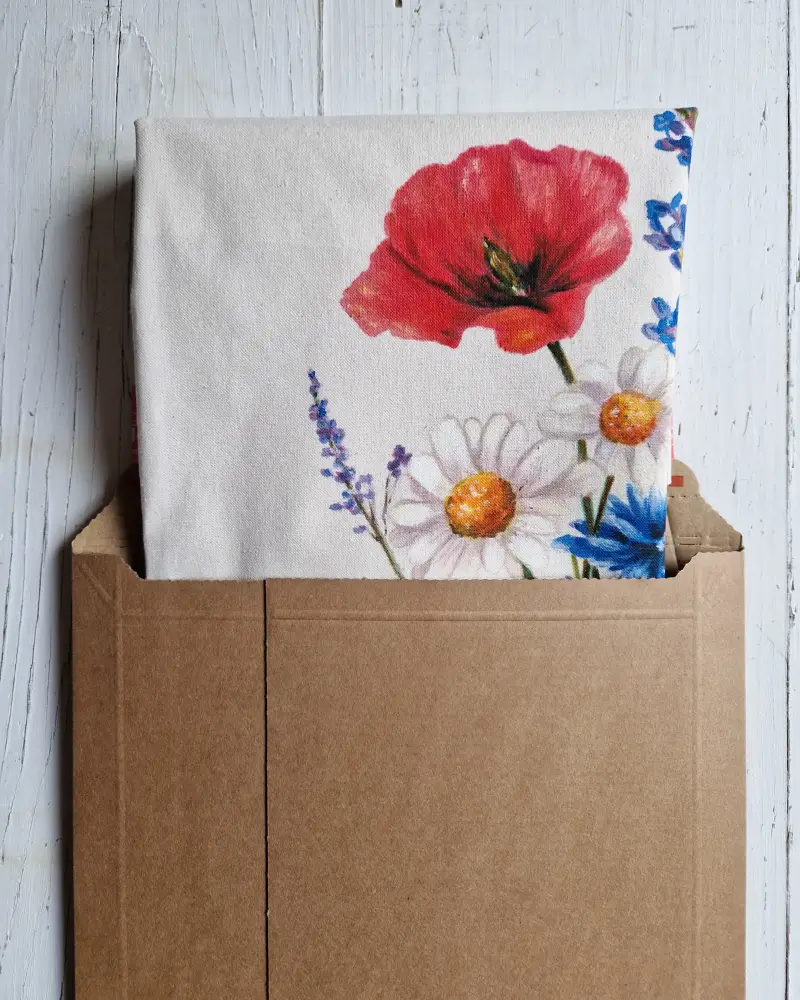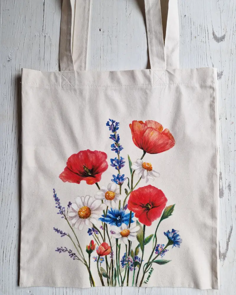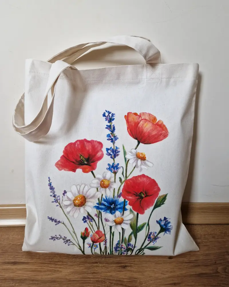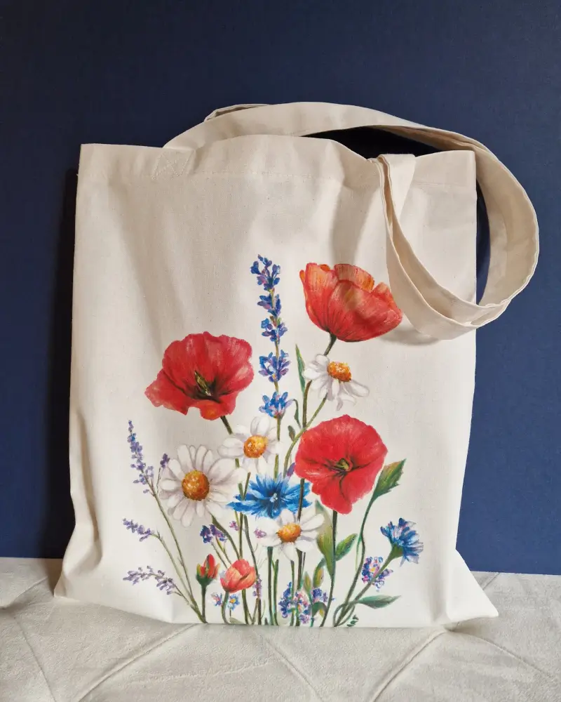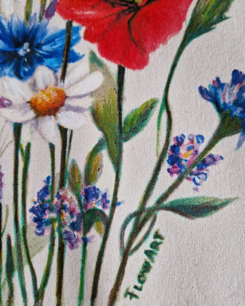 Această sacoșă este pictată manual, cu un buchet de flori de câmp care aduce energie, prospețime și o stare de libertate. Culorile vibrante – roșu, albastru și alb – creează un echilibru natural, inspirat de peisajele de vară.