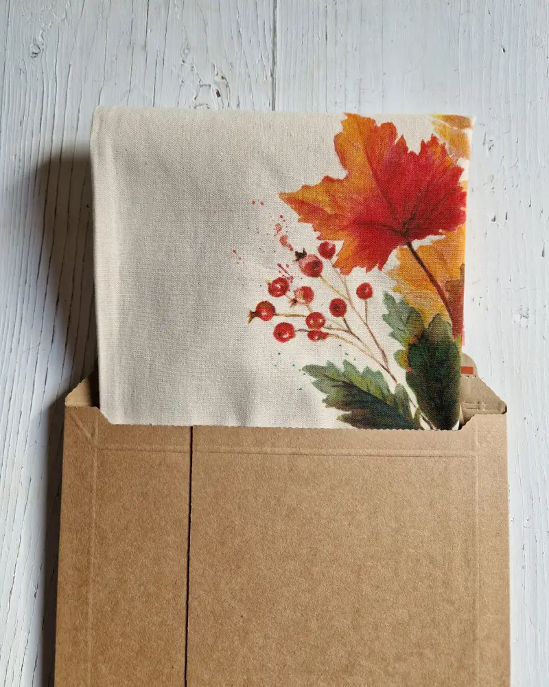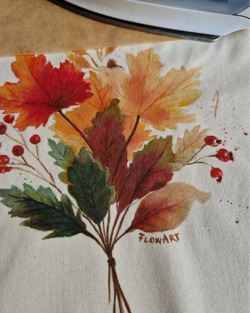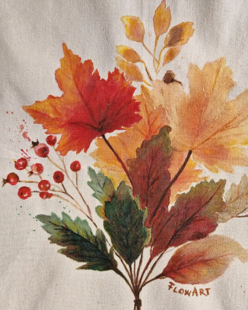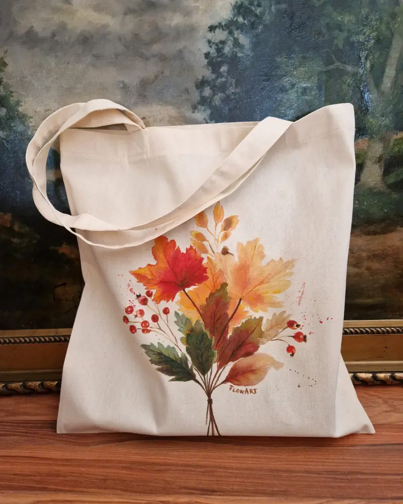 Tonurile vibrante ale toamnei prind viață în această sacoșă pictată manual. Frunzele în roșu, auriu și verde creează o compoziție caldă, plină de energie, care transformă un accesoriu practic într-o piesă artistică.