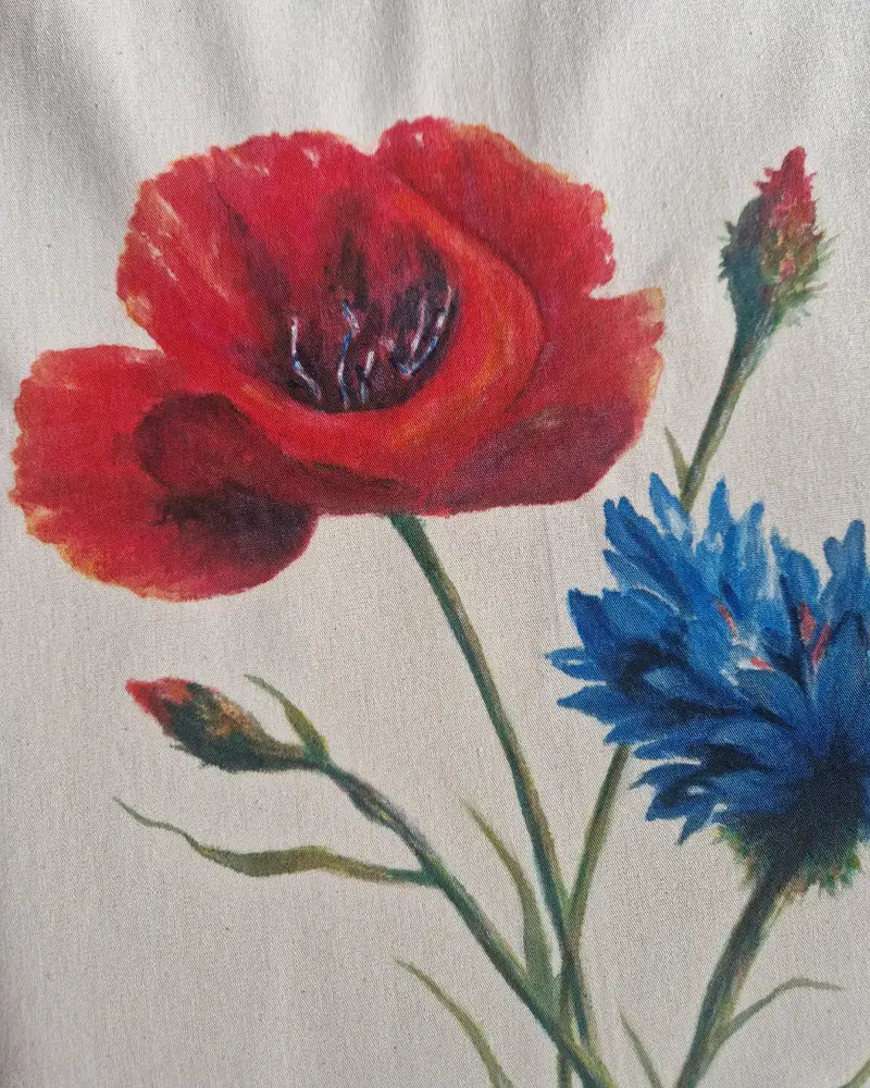 Sacoșa este pictată manual, cu atenție la detalii și la armonia cromatică, astfel încât fiecare piesă este unică. Bumbacul natural o face potrivită pentru utilizare zilnică, iar pictura transformă un obiect practic într-o expresie de artă purtabilă.