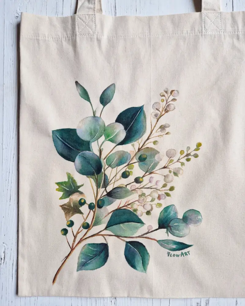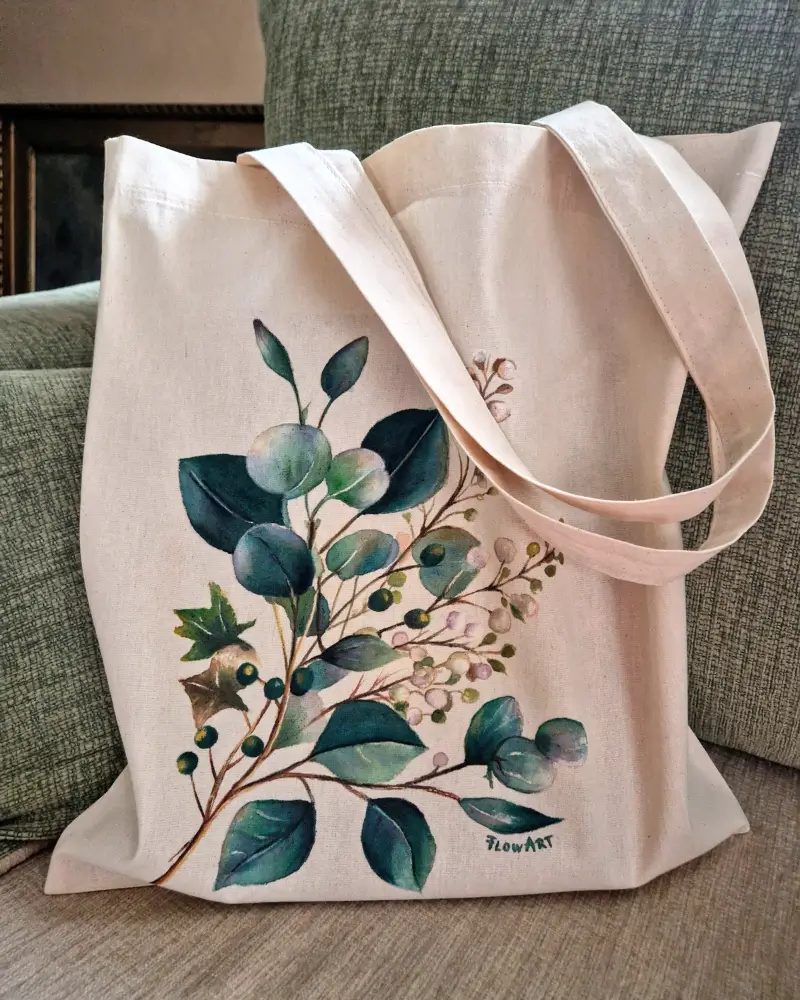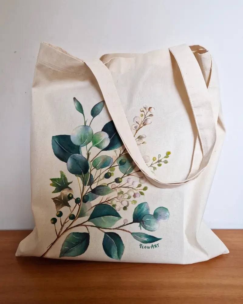 Descoperă o sacoșă pictată manual care aduce un strop de natură în fiecare zi. Această piesă unicat este realizată din pânză rezistentă și ilustrată manual în atelierul Flow Art, cu un design delicat inspirat din frunziș și ramuri fine.