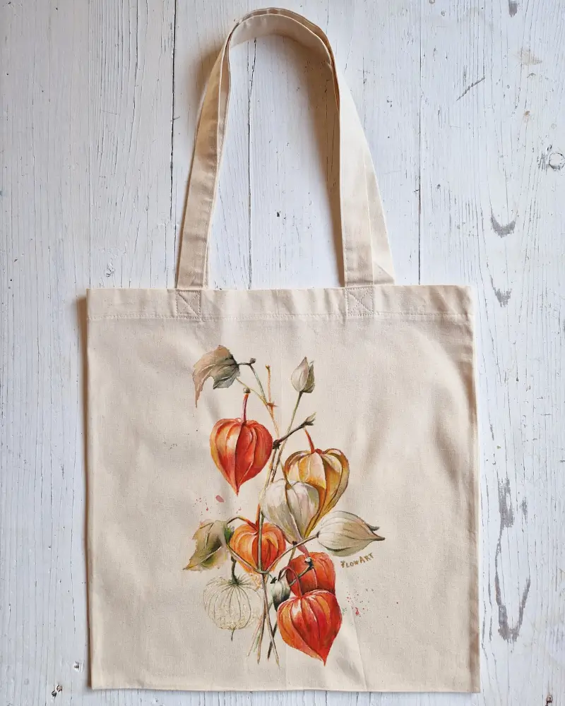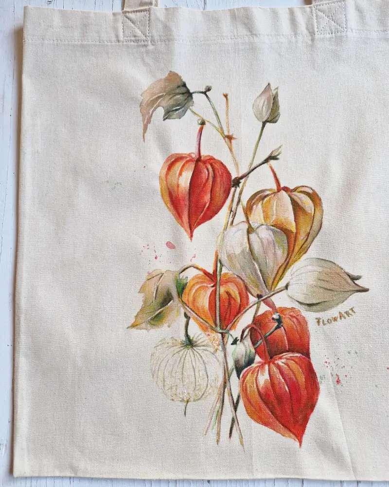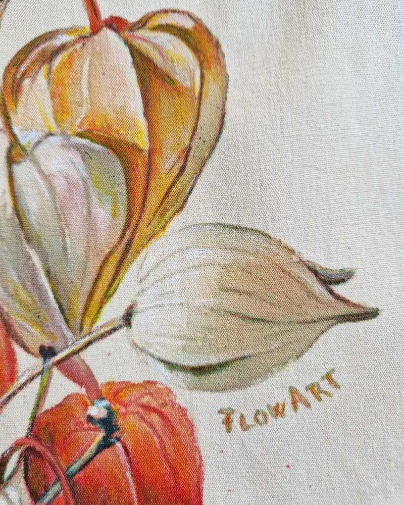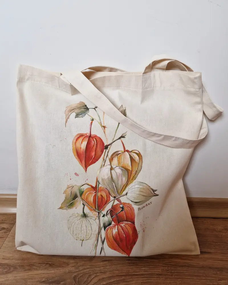Această sacoșă din pânză este pictată manual cu lampioane de toamnă, surprinse în tonuri calde de portocaliu, ocru și ivoire. Formele lor fragile și luminoase creează o compoziție echilibrată, calmă și elegantă.