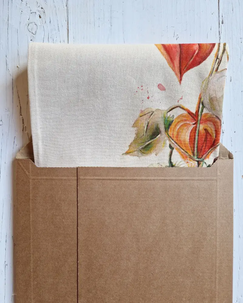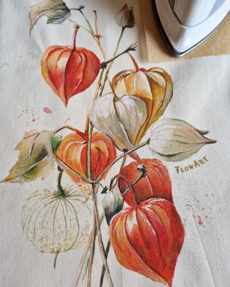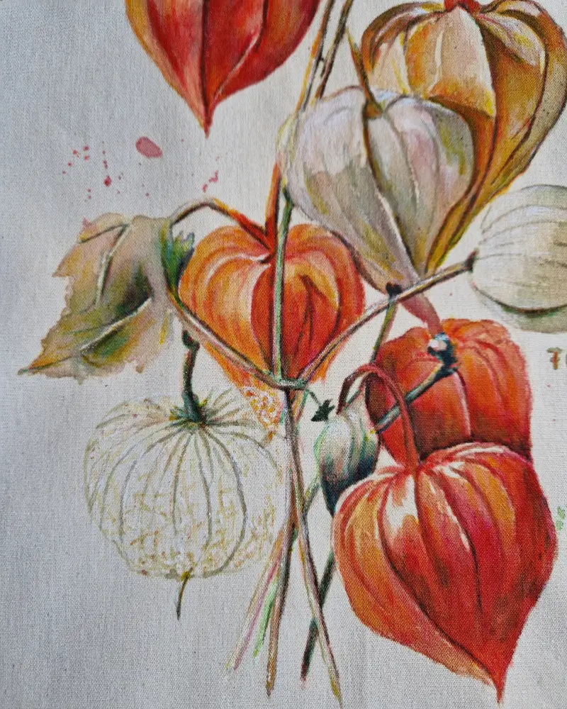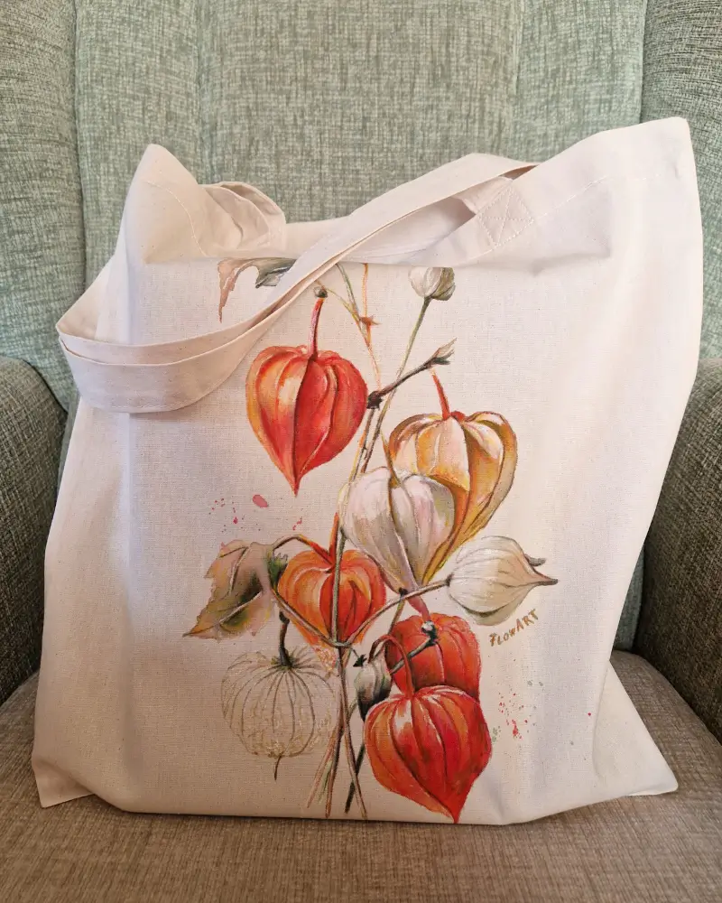 Această sacoșă din pânză este pictată manual cu lampioane de toamnă, surprinse în tonuri calde de portocaliu, ocru și ivoire. Formele lor fragile și luminoase creează o compoziție echilibrată, calmă și elegantă.