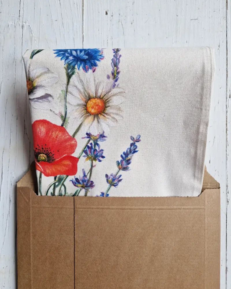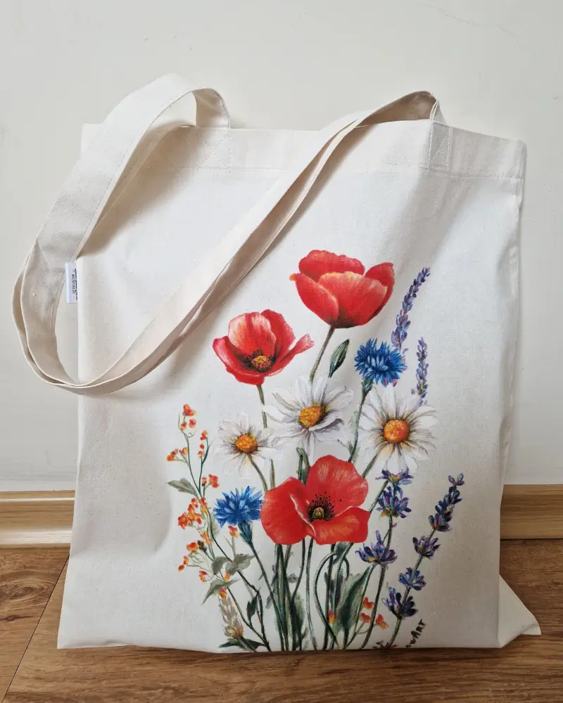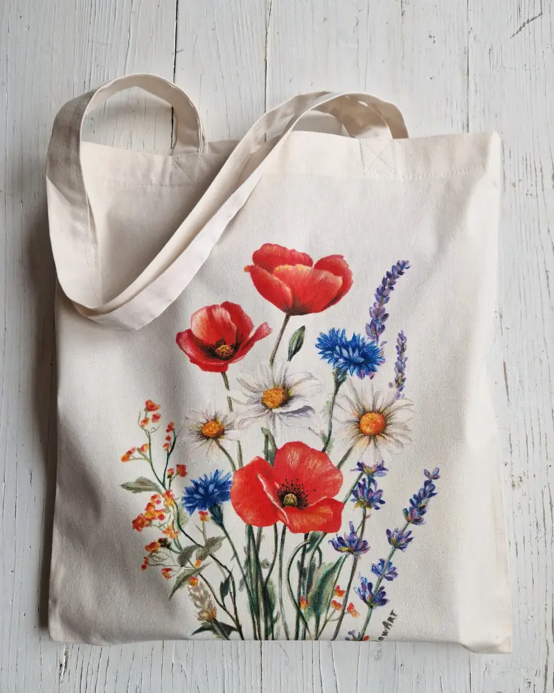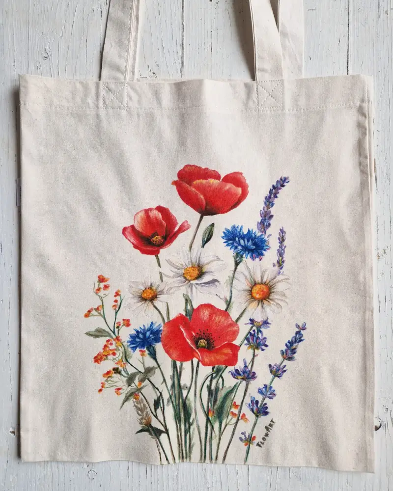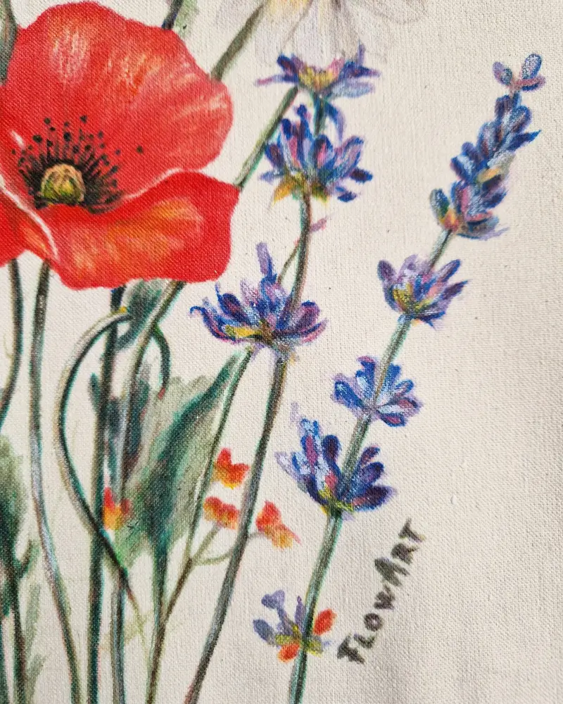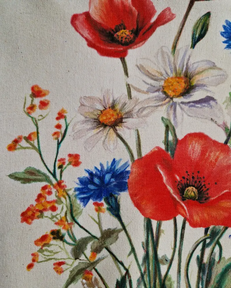 Sacoșa este pictată manual, cu atenție la detalii și la armonia dintre flori. Macii, așezați printre alte plante de câmp, nu sunt tratați ca elemente izolate, ci ca parte dintr-un peisaj viu, în continuă mișcare.