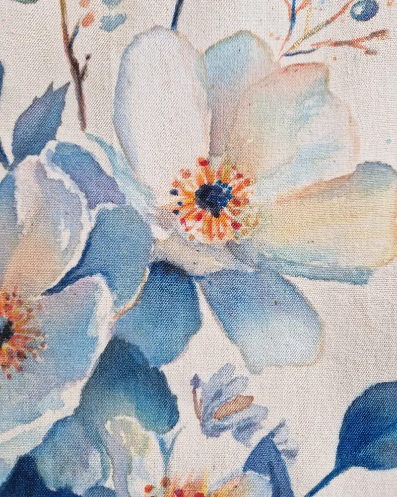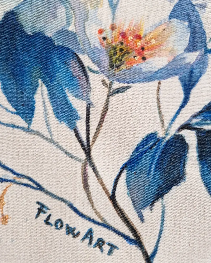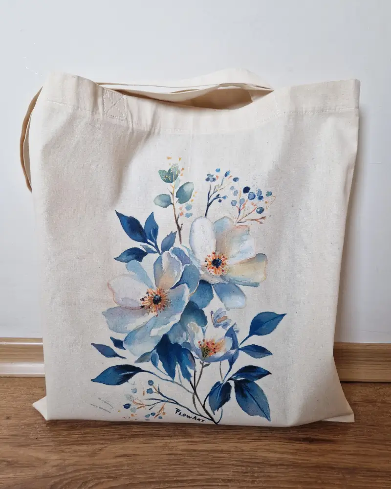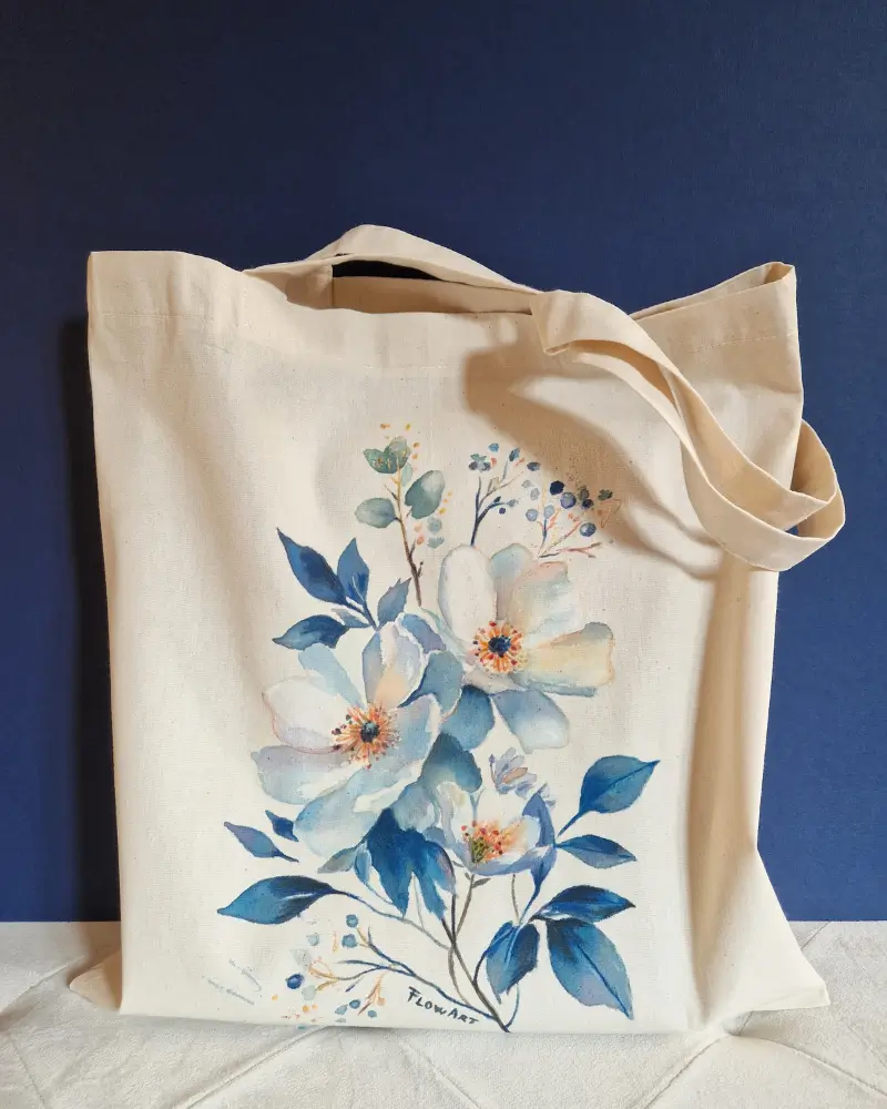 O sacoșă pictată manual, inspirată din liniștea dimineților de vară și din armonia subtilă a tonurilor de albastru. Compoziția aerisită și echilibrată aduce un sentiment de calm și prospețime, fără a fi dominantă.