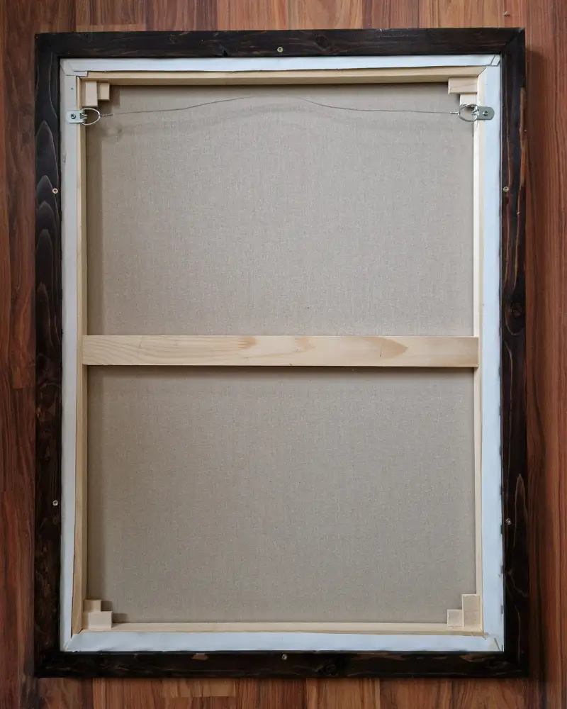 - Pânză 100% bumbac, textură fină (337 g/m²), întinsă pe șasiu din lemn cu profil 2 x 4 cm